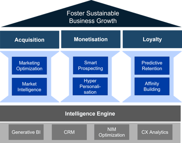 A unified model across four pillars—Acquisition, Monetization, Loyalty, and Intelligence Engine—turning static data into predictive, actionable intelligence.